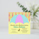 Den här inbjudan till barndusch innehåller ett könsneutralt tema som accentueras med ett stort paraply för teal och lila och lodrät prickade rand över paraplyet. Bakgrunden till färg är gult, men du kan ändra den genom att välja knappen Anpassa och sedan redigera den. Med Anpassade text kan du infoga din egen duschinformation.