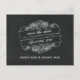 Ett bröllop spara datumet vykort med en ros- och banderolldesign på en svart tavla inspirerad bakgrund. Leta efter matchande inbjudningar och svarskort på Jill's Paperie.