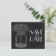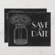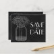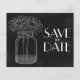 En söt rustic stil Bröllop spara datum annons flygblad med stil-bakgrund i kol-grått och svart. Till lämnad om kortet är en linje teckning från en mason burk fylld med vatten och två enkla daisy blommor. Kommer att passa in ett standardkuvert från USA A6 (medföljer inte).