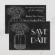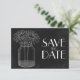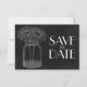 En söt rustic stil Bröllop spara datum-meddelandekortsmall med en stil-bakgrund i kol-grått och svart med-bakgrund. Till lämnad om kortet är en linje teckning från en mason burk fylld med vatten och två enkla daisy blomma.