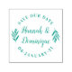 Det här formella gummiet frimärke har namn i ett kalligrafiskt skript med texten "SPARA OUR DATE", ditt speciella datum och två eleganters olivgrenar. Anpassa den här klassiska designen genom att skriva in informationen i mallrutorna.