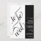 Den här unika bröllopsinbjudan har en modern 2-fönsterdesign med minimalistisk känsla. Den lämnat rutan är vit med svart skriptkalligrafi som läser "ska vara släkt". Högerna eller pub är svart med höger marginaljusterad vit text som stavar ut all information om bröllop. Enkel men ändå elegant, och ett verkligt unikt stil.