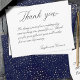 Ett vintage-kalligrafiskript markerar det här bröllop-tackkortet. Kortets baksida har en marin blå bakgrund med utskjutna punkter från guld.