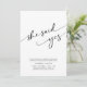 Gratulera till bruden med ett vackert enkelt och snyggt inbjudningskort för möhippan. Med kalligrafi i stollig och ett uppriktigt "Hon sa ja" kombinerar denna svartvita design tidlös elegans med modern minimalism. Det handskrivna skriptet tillför en personlig beröring, perfekt för en chic, ett trendig eller till och med ett Westernt inspirerat firande. Denna prisvärda inbjudan är perfekt för digital delning eller utskrift hemma och gör det enkelt att planera utan att kompromissa med stil. Oavsett om du vill ha en boho vibe eller en klassisk sofistikering, anger den här rena och mångsidiga designen perfektens ton för en minnesvärd möhippa.