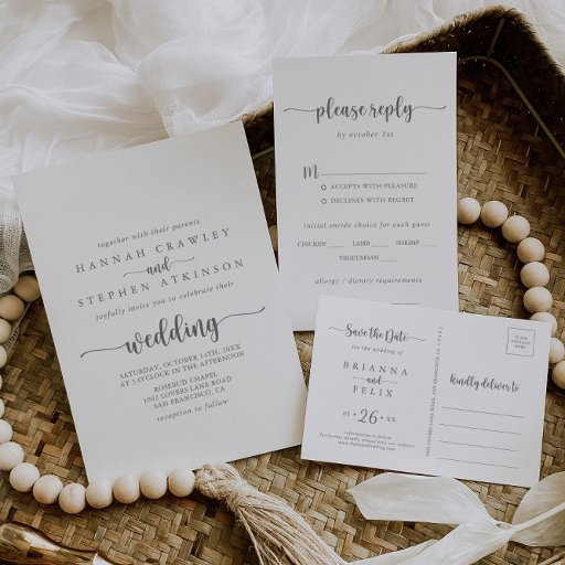 Den här kalligrafinbjudan till silver fram- och bakbröllopet är perfekt för ett rustiskt bröllop. Den enkla utformningen och utformningen av eleganten har skripttypografin klassisk och finare i silver. Spara papper genom att på baksidan av inbjudan ange mer information i stället för på ett separat visitkort.