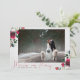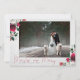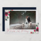 KALLIGRAFI + BLOOM-KOLLEKTION | Röd Merry and Married Foto Julkort. En lyxig festlig julkortdesign med utsökt modern lyxig handskriven kalligrafi i rött, ditt vackra horisontella bröllopsfoto ramad bakom en fin konst vattenfärgspappersstruktur och överdådiga arrangemang av burgunderfärgade peonior, alabasterrosor, järnek och tall, accentuerade med silvergrönska. Baksidan av kortet är en rik marinblå, som i kombination med den burgunderfärgade bladverken, är denna säsongs hetaste färgkombination.