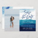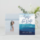 Modern och roligt kalligrafi Spara datumet med vattenfärgen vinkarare och tvättar, med vackra nyanser av marin, djupblå, ljusblå. Konsten liknar oceanen vinkar eller bergen. Ljusblå vattenfärgsfläckar på baksidan.