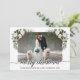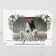 Modern Elegant Kalligrafi Skrift God Jul Vattenfärg Högtid Vinter Grönska Bröllopsfotokort med vita rosor, kottar, järnekbär och botanisk grönska.