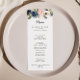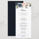 Den här eleganten är ett enkelt menykort för kalligrafi på blommigten under vintern perfekt för ett modernt bröllop. Utformningen har vackra, handmålade mörk blått, blå, marinerade, rosa, blommor, blommor från guld och blad av grönt, buntade i elegant bouquets. Den här menyn kan användas för bröllopsmottagning, repetitionsmiddag, möhippa eller vilken händelse som helst.