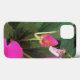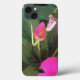 Konsten på denna iPhone 13-fodral är ett originalfotografi av MaeFlowers på en springfröväxt från Nya Guinea, i blom med varmröda blommor. Fotot är en närbild som visar delar av de ljusröda kronbladen, en blomknopp i en mer blekröd färg och resterna av en tidigare blomning. De mörkgröna bladen på springfrön är långa och spetsiga, med taggiga kanter mot en varm ljusgrå bakgrund. Designen har en gobelängstruktur.