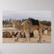 En grupp kameler har samlats i en ökenmiljö, utrustade med sadlar och rep. Vissa kameler knäböjer medan andra står, omgivna av glesa träd under en molnig himmel. Väntar på nästa grupp turister att ta med på en tur i öknen.