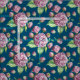 Färgglada akvarell rosa kamelior blommor och knoppar med gröna blad rosenträdgård mönster på en havsblå bakgrund.