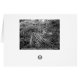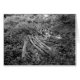 Ett kort med ett svart och vitt foto av ett hugget träd som arrangeras i pilar i undervegetationen. .