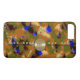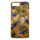 Den ursprungliga collagen av ZoeSPEAK på denna iPhone 8/7 Plus-fodral är ett kamouflagemönster som är utformat för de tillfällen då du vill bli sedd. Det grundläggande mönstret är gjort av traditionella kamouflageformer i dämpade färger, jordtoner av tan, brun och olivgröna nyanser. Men genom detta framträder runda former genom kamouflaget i ljus koboltblå färg. Fodralet är utformat som en clutchväska. Kanten på väskans toppflik är dekorerad med ljus olivgröna skivor med blå prickar i mitten, som ser lite ut som paljetter. Väskans spänne är en guldfärgad oval som böjer sig utåt med en highlight i mitten. Det finns ett monogram i svart i mitten av spännet. Detta