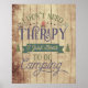 Roligt, stil ord art citerar: "Jag behöver inte terapi, jag behöver bara gå och campa" på den nödlidande träbakgrunden