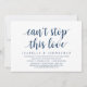 Modern marinblå scripta tema, bröllopsflykt inbjudningskort (Kan inte stoppa denna kärlek). Det är perfekt för din bröllopsflykt, avslappnad sjösidebröllops middag, dans och fest.