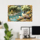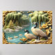 Två majestätiska kanadengäss står på framträdande plats på en serenriverbank, omgiven av en stillastående piskning, viftande viskgrät träd som högljutt våldtar över det fredliga vatten där dunklingar försiktigt paddlar. Golden-blommorna blommar på ornat ramar och lägger till en aning av stollig på den vridande scenen.