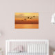 Sex kanadensiska gäss ses flyga i bildningen mot en solnedgång i himlar. De flyger över vatten och den mörka konturen av en segelbåt ses vid horisonten.