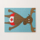 En tecknadtolkning av den underbara kanadensiska älgen som ha på sig hans patriotiska dräkt med en blåttbakgrund.