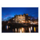 Foto av de romantiska gamla husen i Amsterdam, byggt längs Prinsengrachtkanalen, med reflektion av ljus i det stilla vatten i början av natten i Hollands huvudstad.
