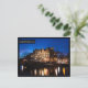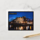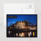 Ett vykort från de romantiska gamla husen i Amsterdams stad, byggt längs Prinsengrachtkanalen, med en reflektion av ljus i det stilla vatten i början av natten i Hollands huvudstad med ett svart kant och texten "Amsterdam".
