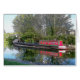 Den ljusröda färgen från en smal båt reflekterar längst vatten i kanalen på en idyllisk scen på den engelska landsbygden