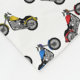 Det moderna och moderiktiga mönster för motorcyklar för anpassningsbarnamntecknaden med färgrika cyklar i rött, görar grön, slösar och gulnar med vitbakgrund och med svärtar gråttranden som precis personifieras, tillfogar dina kända gåvor eller monogramgåvor eller din initialer för en unik gåva. Bäst de för manar motorcykelgåvaidéerna och pojkar och flickor.