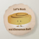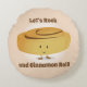 Rund Pillow med en leende kanel som står mellan ord"Let's Sten och Cinnamon Roll!". ord kan anpassas.