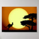 Denna illustration visar en silhuett av en känguru som hoppar omkring i gräsmark under solnedgången.