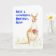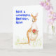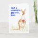 Ett födelsedagskort för mor, med en handmålad känguru med baby i sin påse, ge henne en blombukett. Blanka för ditt eget meddelande.