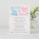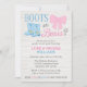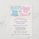 Söt inbjudan för könsbestämningsfest med kängor och rosetter. Det här landliga temat har en rosa rosett och blå cowboystövlar på en ljus trähylla.