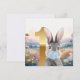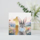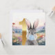 Grått-kanin med rosa öron som blåser en blå bubbelgum i fält på vilda blommor. Första födelsedag med guld nummer ett