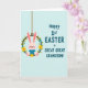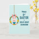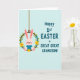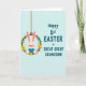 Det här kortet visar en ljusrosa kanin i en mjuk blå dräkt som sitter mysigt i en grön blomsterkrans med en mild och tillgiven min som känns som en familjekram 🐰. Kaninens långa öron lutar sig lite uppåt, med en liten röd näsa och rosiga kinder som ger en öm och vänlig charm. Kransen är gjord av en brun vinrings och dekorerad med små gula och blekblå blommor, inklämda bland bladrika gröna kvistar som en vårminnessak 🌷. Ett tunt brunt hängande snöre högst upp får kransen att se ut som om den svävar, som om den svajar lätt i luften. På höger sida står det tealblå bokstäver i stora, lättlästa versaler som säger “Happy 1st EASTER GREAT GREAT GRANDSON!” staplade över flera rader. Texten sitter mot en blekblå bakgrund med svag diagonal linjestruktur, vilket ger layouten en lugn och luftig känsla