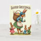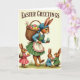 Denna design visar en stor antropomorf kanin i en blå huvudduk och blus med en grön förkläde, som står lugnt medan den håller en flätad korg fylld med dekorerade ägg 🐰. Med rosiga kinder och en mild, omtänksam blick lutar den sig framåt som om den erbjöd ett ensamt blått ägg till en vän strax utanför bild. Till vänster vaggar en mindre kanin i en rosa klänning en liten korg och ett gult ägg, och tittar med ivrig, tillgiven uppmärksamhet. I förgrunden möts två små kaniner ansikte mot ansikte, med tassarna mot varandra medan de delar på ett rosa ägg i en söt, delande stund 🐇. Mjuka pastellbruna, gröna och blå nyanser formar pälsen och kläderna, medan äggen tillför ljusare färgnyanser över scenen. Nära to