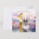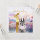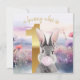 Första födelsedag-Grått-kanin som blåser en rosa bubbelgum i fält av vilda blommor "en kniv som är"-text ovanför guld nummer ett