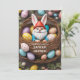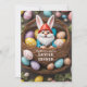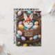 Kanin Gnome korg med ägg Påskmiddags inbjudan. Gör detta för brunch eller frukost. Gnome i en korg med påskägg som bär kaninöron. Anpassa denna mall med text på framsidan och baksidan av kortet.