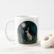 En kanin i lycklig sitter i månljuset i blommor och andra växter med hög träd i bakgrunden.