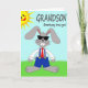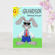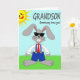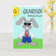 Denna gratulationskort har en upprättstående grå kanin 🐰 centrerad på en remsa av grönt gräs under en klar blå himmel, vilket ger scenen en lätt, solig känsla. Kaninen bär mörka rektangulära glasögon, en vit skjorta, blå overall med gula knappar och en röd slips, och dess stora framtänder ger en vänlig, lite blyg charm. En leende gul sol med strålar sitter nära det övre vänstra hörnet, som om den lyser ner på kaninen som en glad kamrat. Nära toppen är huvudetxten stor och lätt att läsa, med den pun-filleda frasen “Somebunny loves you!” placerad tydligt tvärs över det övre området i en mörk, högkontrastfärg. Kaninens upprätta pose och snygga klädsel tyder på att den klätt upp sig bara för att imponera på någon speciell 🐇. Enkla former och solida färgområden håller fokus på den ömma, lättsamma stäm