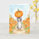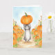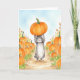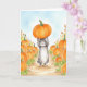 Detta vykort har en vattenfärgporträtt av en kanin som håller en pumpa över huvudet medan den går genom en pumpaodling.