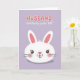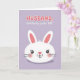 Det här kortet visar ett stiliserat vitt kaninhuvud som vilar i den nedre delen av designen, mot en mjuk lavendelbakgrund 🌷. Kaninen har upprättstående öron med rosa detaljer på insidan, små svarta ögon, en liten rosa näsa och runda kindben som ger den ett ömt och vänligt uttryck, som om den lutar sig fram för att hälsa någon väl. Strax ovanför kaninen sitter ett tvåradigt meddelande i den övre halvan, där den första raden är i korallfärgad text och den andra raden är i vit text för en mjuk kontrast. De rundade bokstavsformerna känns mjuka och tillgivna, vilket ekar kaninens lugna uttryck och ger en mysig och nära ton 🐰. Fina linjer för morrhår och en liten böjd mun ger en antydan till värme, som om kaninen ler tyst åt någon särskild. En svag skugga under kaninhuvudet får det att sticka ut från bakgr