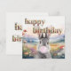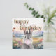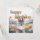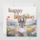 Grått-kanin med rosa öron som blåser en blå bubbelgum i fält av visblommor Grattis på födelsedagen som är skapat med torkade blommor