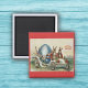 Den här kvadratiska Påsk-Hälsning-magneten har två kaniner vintage bild i en antika vit bil med ett stort blått Påskägg på röd bakgrund med texten Påsk Hälsning.