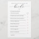 Testa hur väl gästerna känner till briden att vara med det här möhippan för snyggt. Med en minimalistisk utformning med mjuka accenter och typografi av eleganten ger den här dubbelsidiga aktiviteten roligt, ljusa svar som skapar konversation och skratt. En isbrytare för perfekten och en viktig nyhet för moderna eller neutralt-temade duschar. Koordinerar med fullt Minimal Modern Möhippa | Framtidens fru-samling.