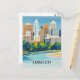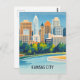 En reseaffisch vintage-stil med ikonen Kansas City skyline. Bilden visar stadens särskiljande skylt, poster är designad i ett stil med en pulserande färg-palett och en nostalgisk känsla.