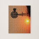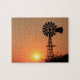 En Kansas golden orange Sunset som är ljust och färgstark med en Kvarn silhouette norr om Hutchinson Kansas USA. Det är på PUZZLE.