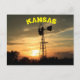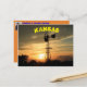 Ett skott av en Kansas Sunset med en Kvarn Silhouette med moln och träd norr om Hutchinson Kansas ut i land. Det är på ett POST-kort.