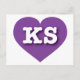 Detta vykort har ett pulserande lila hjärta som innehåller det feta, vita, övre fodral brev KS, förkortningen officiell för Kansas, solrostillståndet. Baksidan av vykortet är tom och väntar på dina handskrivna känslor eller anpassade texter.