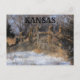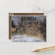 Ett skott av ett gammalt Kansas-trästängsel med snö och träd med blå himmel och ogräs som är ljust och färgstarkt. Det är norr om Hutchinson Kansas USA som är på ett POST-kort.