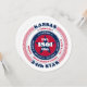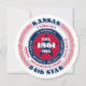 En djärv, patriotisk design med rött, vitt och blått framkallar känslor av frihet, lojalitet och enhet. Statens namn, "Kansas", visas framträdande, omgivet av information om huvudstaden, invånare, region, tidszon och geografiska koordinater. Baksidan är tom - lämna den som den är eller lägg till din text genom att öppna designverktyget. Perfekt för nationella helgdagar och patriotiska evenemang.