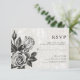 Detta stilrena bröllop RSVP-kort har en gråvit bakgrund med en kantig textureffekt och en viktoriansk illustration av svarta och vita vintage rosor som har förvandlats till en mycket modern utseende.